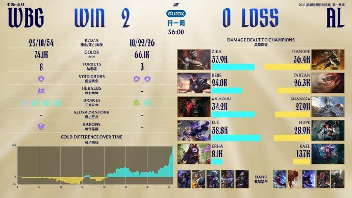 第一波碰撞发生在巢虫团,AL打出2换3拿到一点点优势,但Xiaohu乌鸦吃到两颗人头发育不错。随后Jiejie下路反蹲击杀鳄鱼并顺势控下小龙,WBG的后期阵容有了拖下去的资本。Elk接下来在中路发难,杀掉守中一塔的Kael。WBG控下龙魂后又拿下大龙,直接在AL高地游龙后结束比赛,拿到三个赛点!