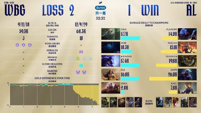 本局前期人头爆发不少,但没有一边确立绝对的优势,但WBG控下了更多的小龙。AL选择之前Rush大龙破局但Jiejie闪现接惩戒抢下大龙,Xiaohu永恩大招命中多人AL团战瞬间爆炸,在一波未果后WBG选择拿下龙魂后再次推进结束比赛!